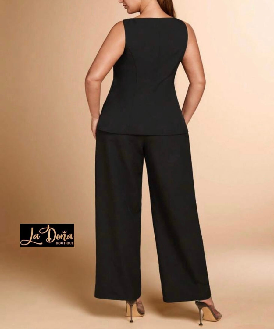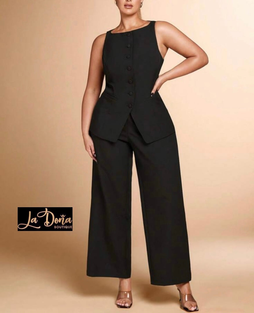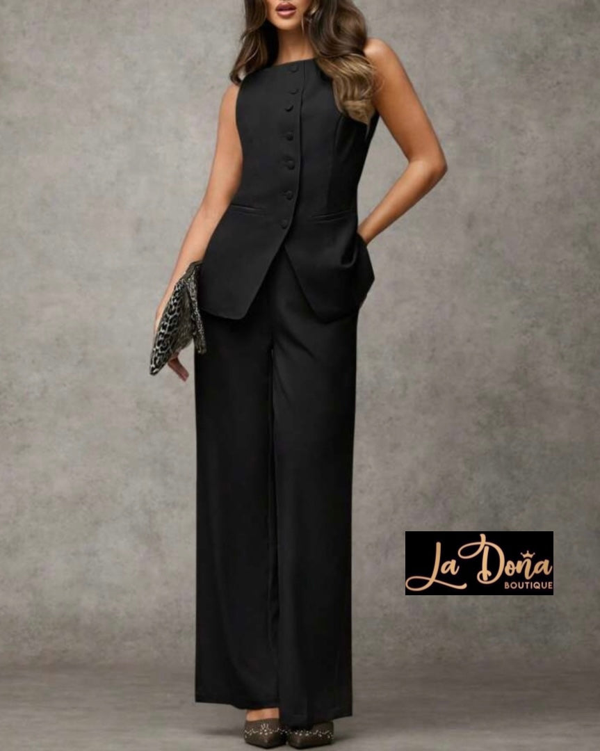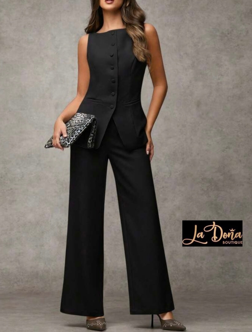 Conjunto de pantalones y chaleco blazer negro con botones.