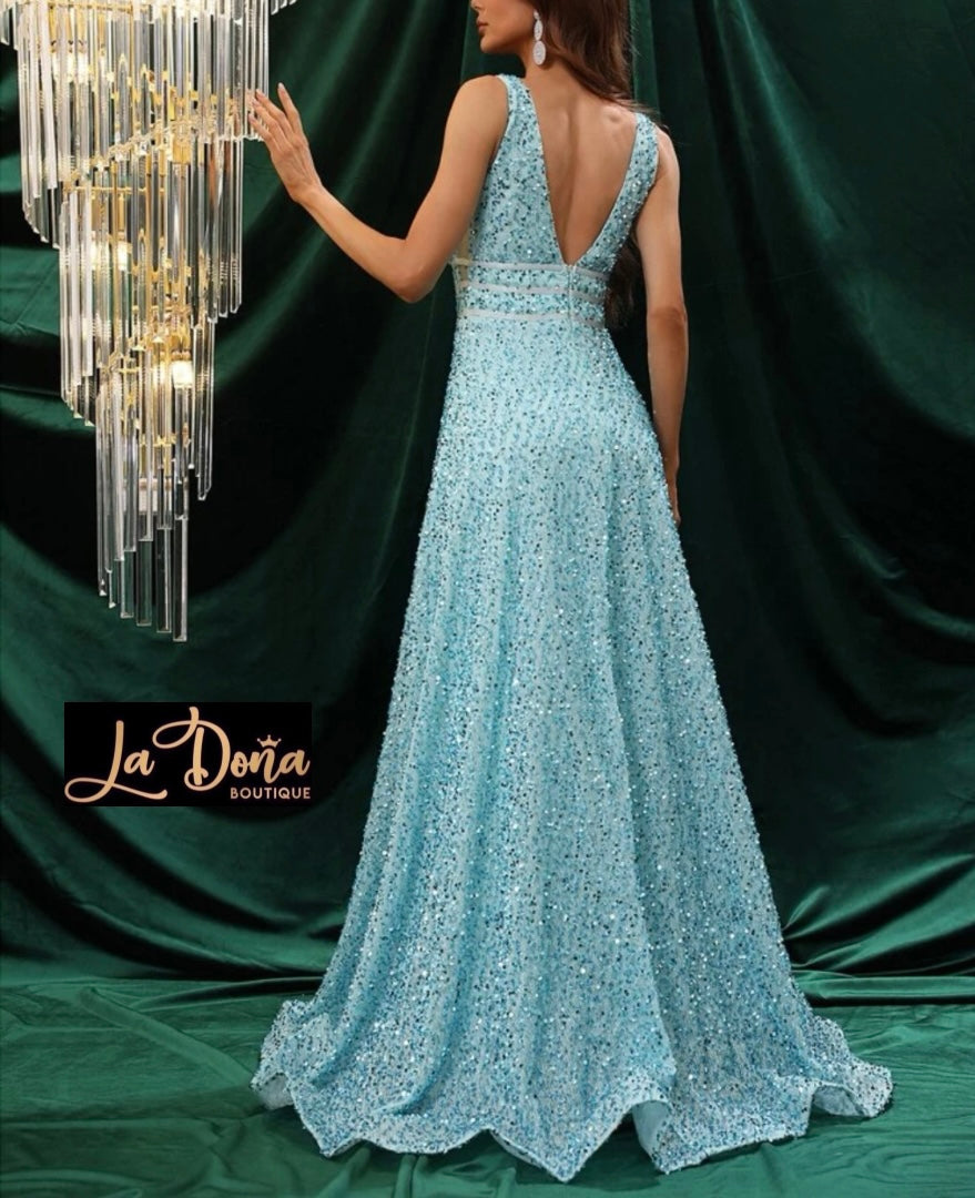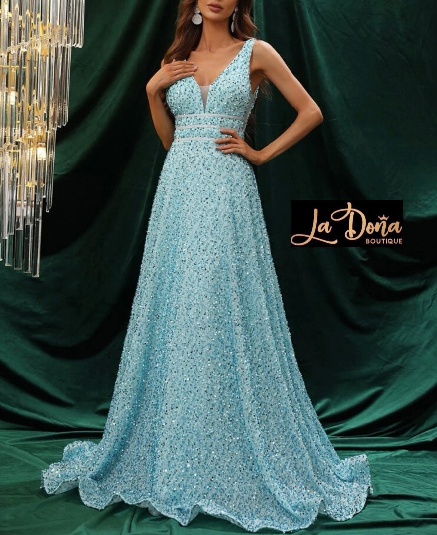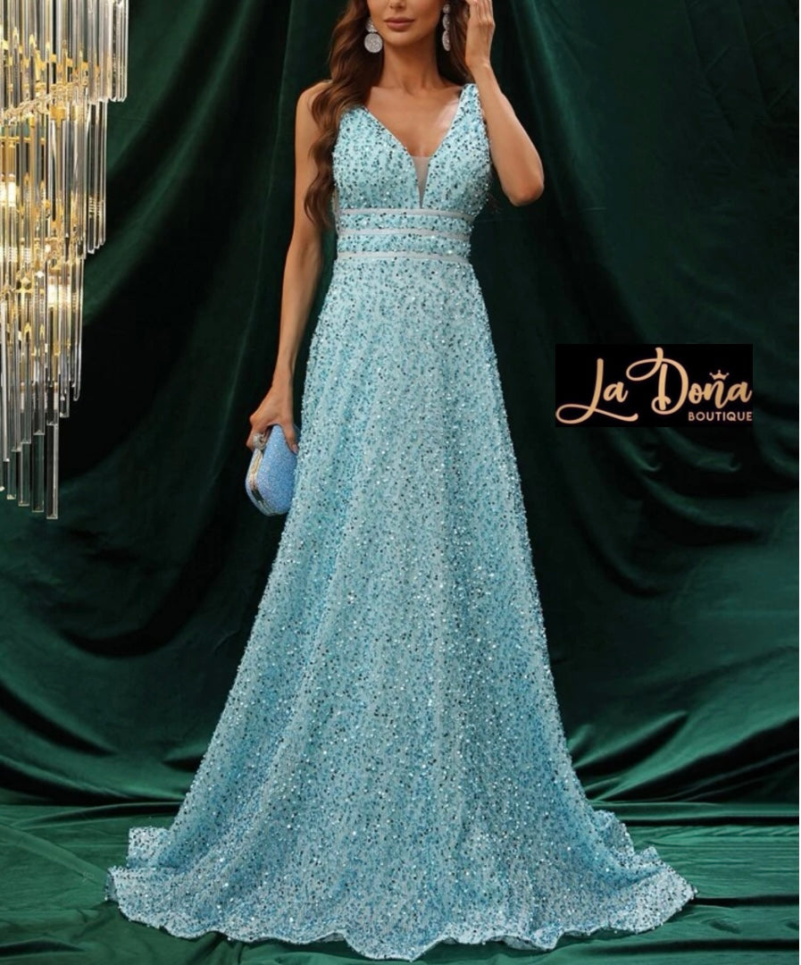 Vestido largo de noche en color azul cielo, con lentejuelas.