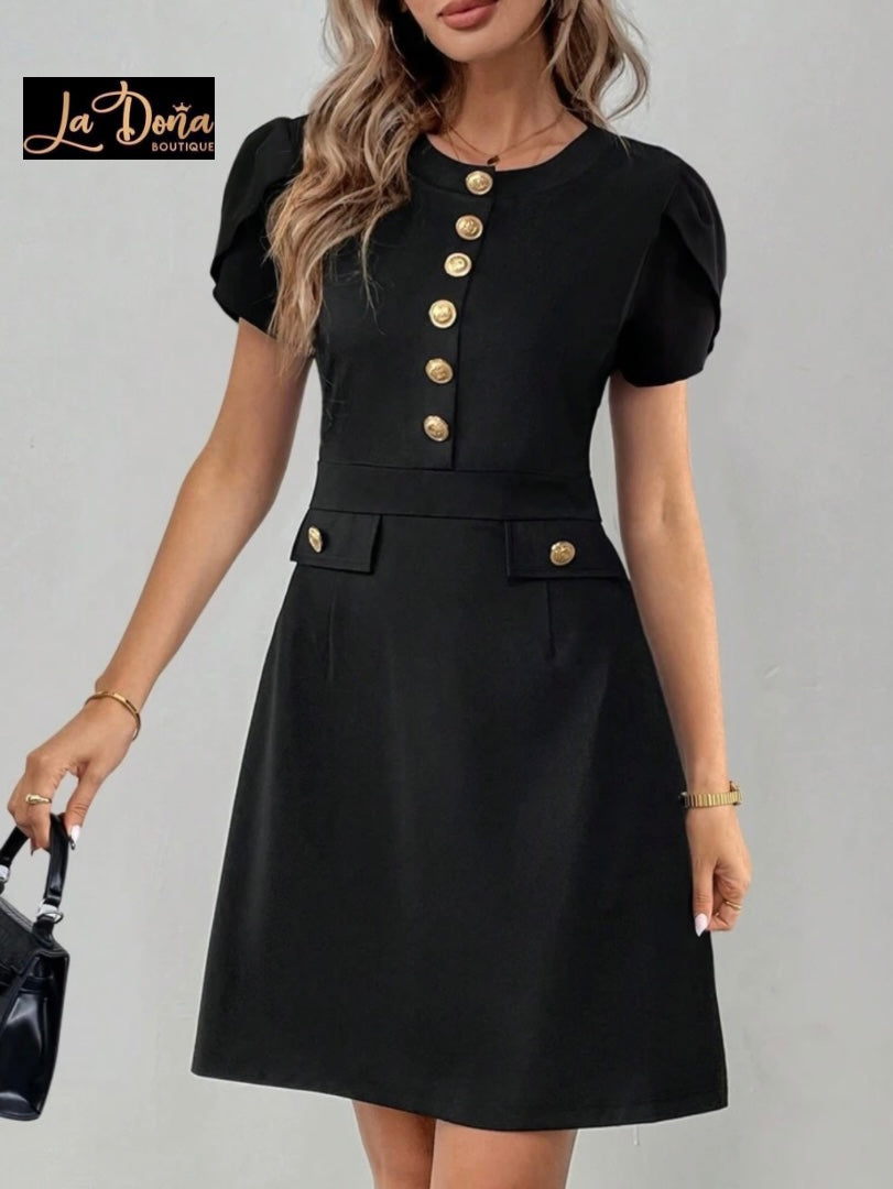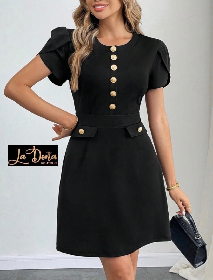 Vestido negro corto con botones dorados corte A